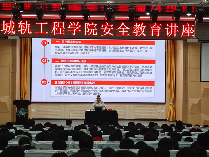 3月5日晚,陕西铁路工程职业技术学院后勤安保处干事乔梁应邀在高新校区博爱厅为城轨学院500余名学生作了一场 “预防电信(网络)诈骗小知识”的专题讲座。