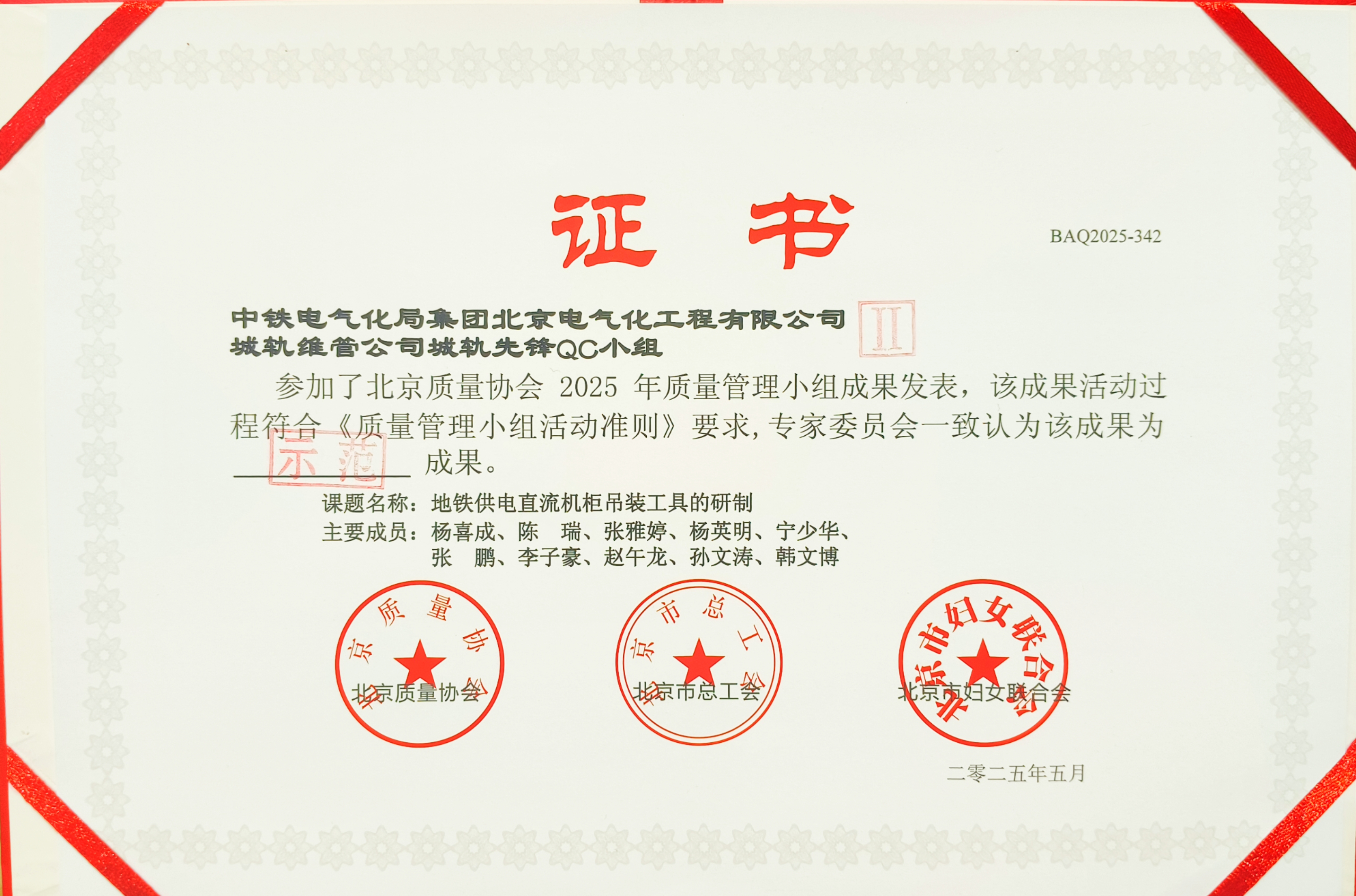 (国铁路网、交通运输新技术网通讯员 张运飞)5月19至日21日,2025年落实工信部质量品牌建设工作北京质量协会《质量管理小组活动准则》培训暨活动管理小组成果交流发布会在北京顺义顺利召开,中铁电气化局集团北京电气化公司城轨维管公司“城轨先锋QC小组”凭借卓越表现又双叒叕载誉而归!