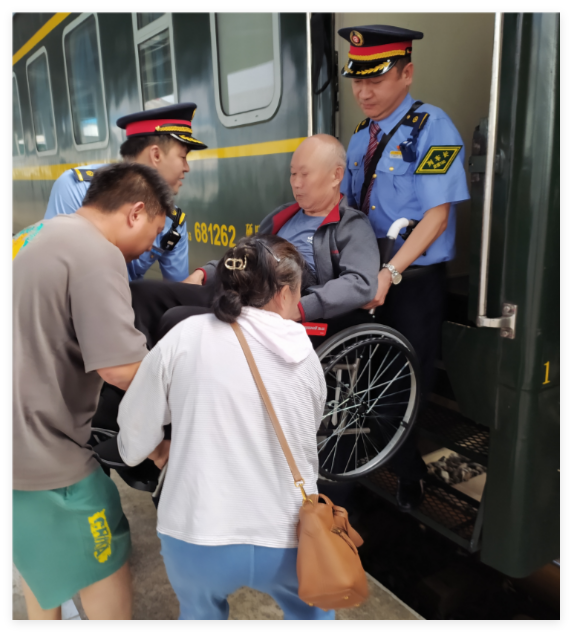 低站台前的未雨绸缪:服务精度丈量文明高度。6月3日,列车距颍上站还有1小时车程,姬磊对讲机已响起与车站的协调声:"低站台轮椅下车需要3人协作,麻烦准备好平坡板。" 这通电话的背后,是铁路人对细节的极致把控——颖上站低站台与列车地面落差达30厘米,普通台阶对轮椅而言是巨大障碍。他提前在车厢门口铺上防滑垫,又与两名身强力壮的列车员演练抬轮椅的姿势,"左手托住轮椅背,右手稳住脚踏板,起落要同步!"当列车停稳,三人组成的"接力小组"以标准动作将老人平稳抬下列车。早已等候在站台的颍上站工作人员接过轮椅时,兰先生的儿子红了眼眶:"从上海到颖上1200里路,你们没让我爸受一点委屈。" 更令人动容的是姬磊递出的纸条:"老人左腿知觉较弱,搀扶时请留意支撑点。"这短短一行字,是12小时旅途中观察到的细节,更是铁路服务从"送达到"到"服务好"的质变见证。​