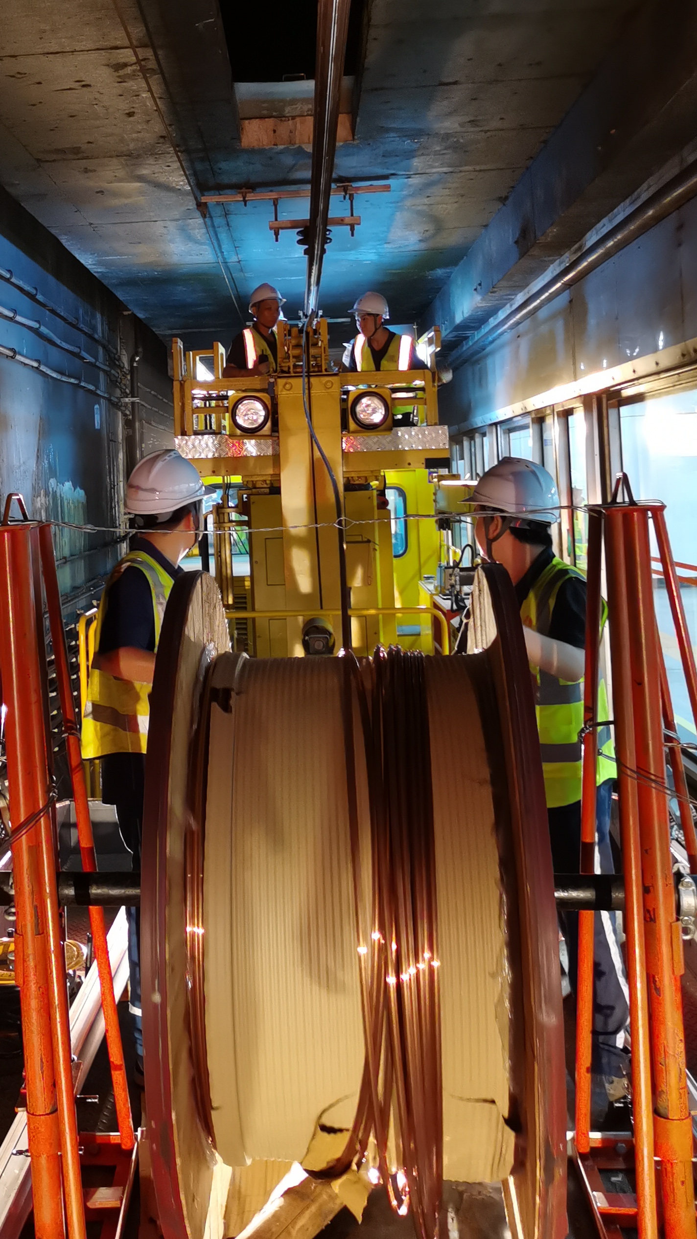 “梯车向下行方向”、“一二走、一二走......”,梯车指令和号声在隧道内交互起伏,拆线小车控制人员在梯车上与拆线小车地面牵引人员默契协作,用时30分钟将235.9米导线人工拆除完成。剪线人员紧随其后,两人一组,一人扶线一人裁剪,三组人员交换裁线、绑扎、放置小站台一气呵成。