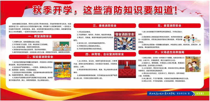 ——创新宣传形式,推动消防知识入脑入心。开学前夕,学校精心策划制作“秋季开学,这些消防知识要知道!”主题宣传栏,覆盖两校区宿舍区等人流密集区域。宣传栏采用醒目的红底白字设计,配以生动的漫画插图,围绕教室、实验室、宿舍、食堂、体育馆等区域,详细列出防火要求与注意事项。“火场逃生自救指南”板块以简明语言介绍火情处置流程与逃生自我保护方法,图文并茂、直观生动,使新生在潜移默化中掌握安全常识。