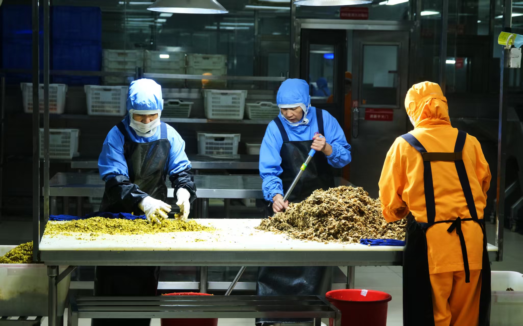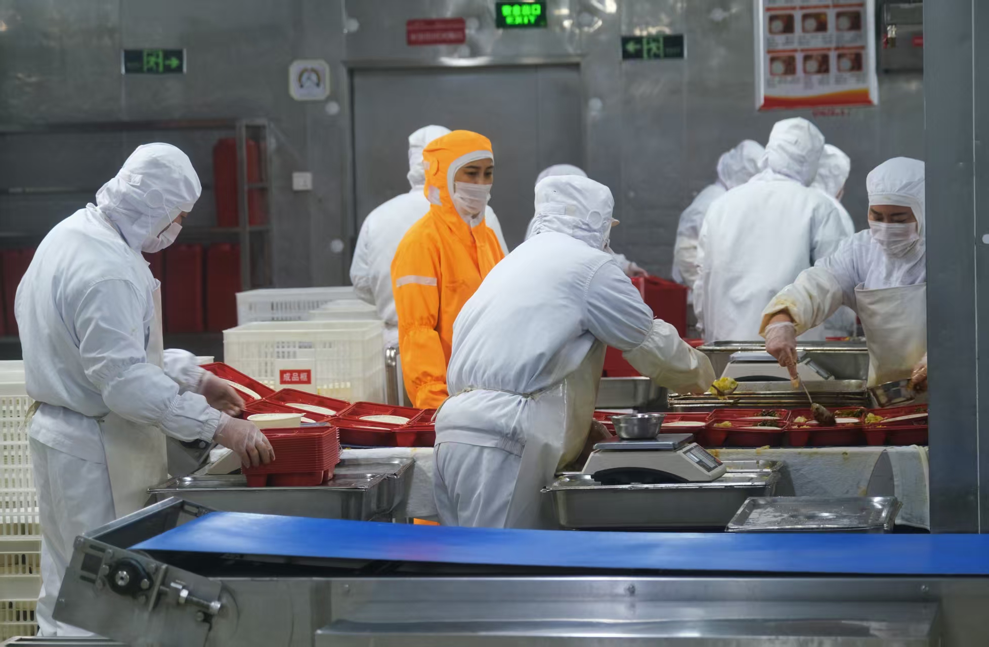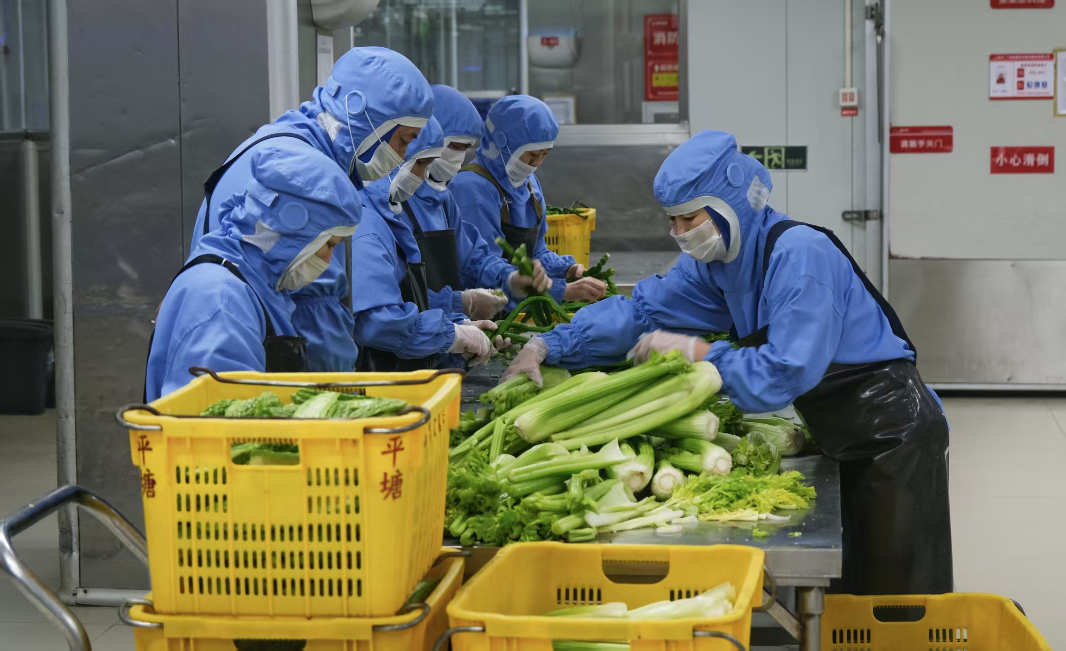 进入作业区域可以看到分拣、切配、加工、烹饪、分装、配送等生产线上,穿戴不同颜色防护服的工作人员井然有序地忙碌着。