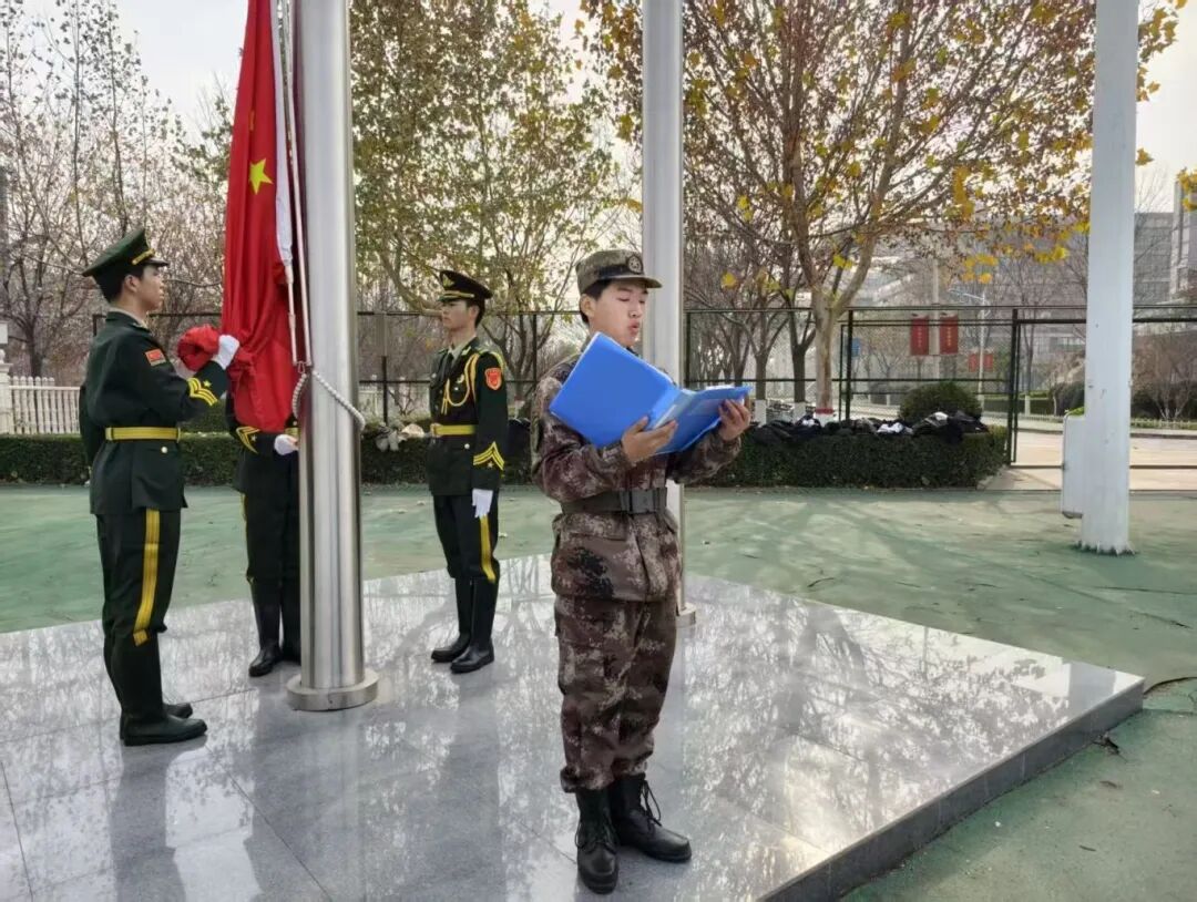 活动在庄严的升国旗仪式中拉开帷幕。全体队员肃立行礼,高唱国歌,共同缅怀那段峥嵘岁月。护校队中队长刘凯强在国旗下讲话,带领队员们回顾“一二·九”运动的光荣历史,号召大家将爱国情怀与学校“吃苦奉献、拼搏争先”的精神传统紧密结合,以实际行动践行守护校园、服务师生的责任担当。