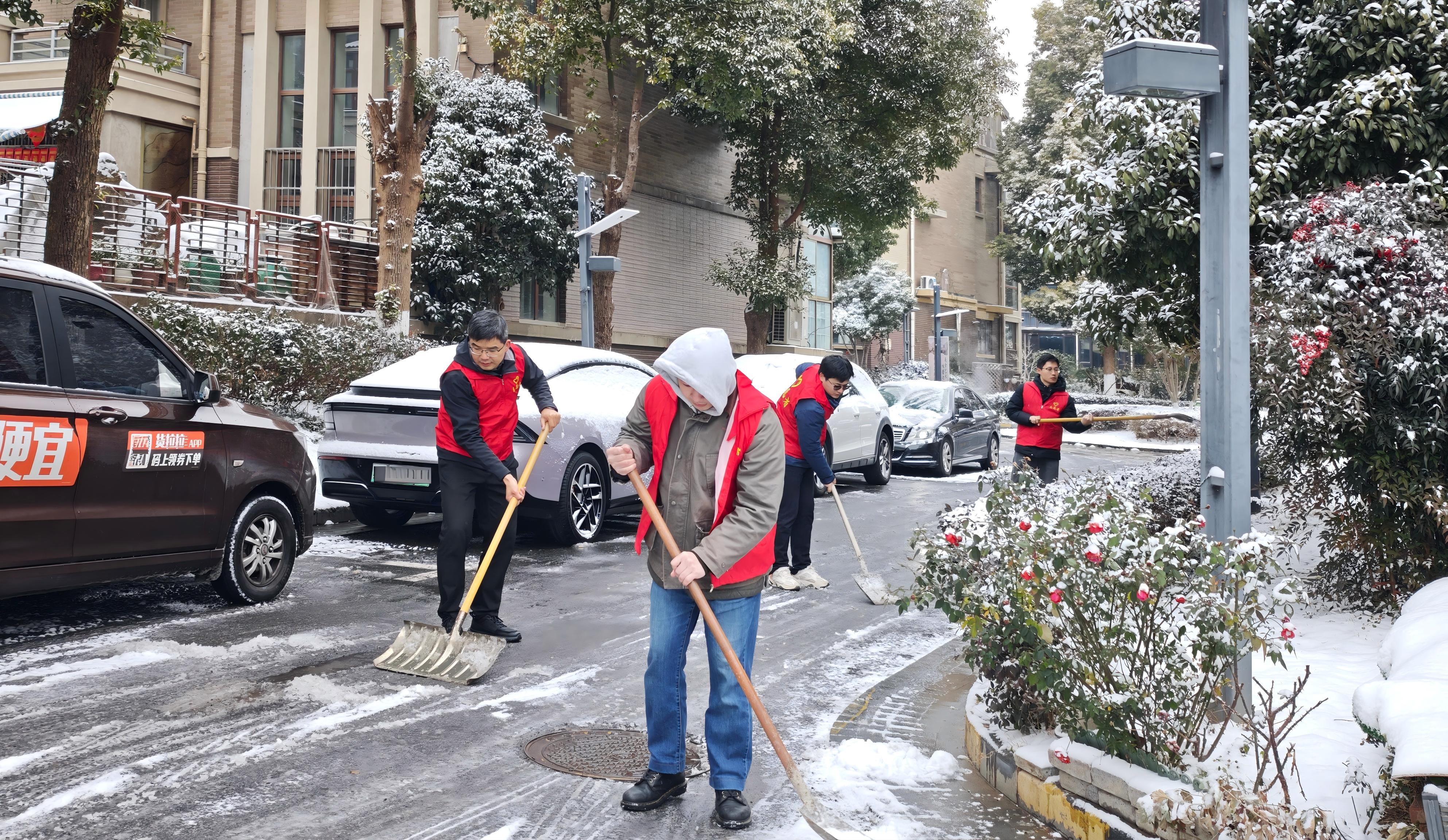 面对严峻的降雪冰冻形势,中铁物贸上海公司江苏经营中心党团组织第一时间与驻地物业取得联系,双方快速敲定了协同联动除雪方案——由物业提供部分除雪工具与重点除雪区域清单,经营中心则发出倡议,号召在宁青年员工组建“扫雪除冰志愿服务队”,共同为市民扫清出行障碍,主动扛起社会责任。倡议发出后,青年员工们积极响应报名参与。大家在取到铁锹、扫帚、除雪铲等工具后,于当日上午迅速集结,奔赴周边结冰严重的路段,开启扫雪除冰工作。