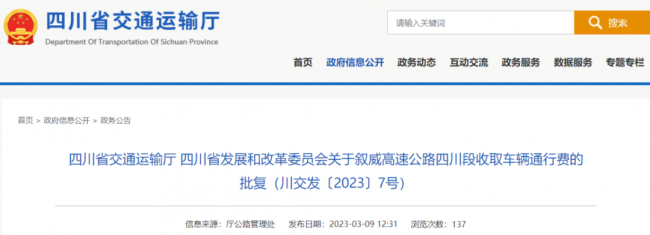 3月9日,四川省交通运输厅网站发布消息,经四川省人民政府同意,根据四川省交通运输厅、四川省发展和改革委员会《关于叙威高速公路四川段收取车辆通行费的批复》《关于泸永高速公路收费立项和收取车辆通行费的批复》,叙威高速四川段、泸永高速将于2023年3月17日零时正式联网收取车辆通行费。一类车收费标准分别按0.82元/车·公里、0.71元/车·公里执行。2023-03-14