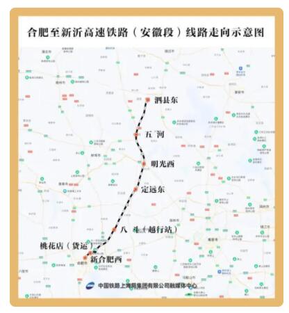 合肥至新沂高速铁路(安徽段)起自合肥市,途经滁州市定远县、明光市、蚌埠市五河县、宿州市泗县后进入江苏境内。线路共设泗县东、五河、明光西、定远东、八斗、桃花店、新合肥西等7个车站。2022-10-18 -