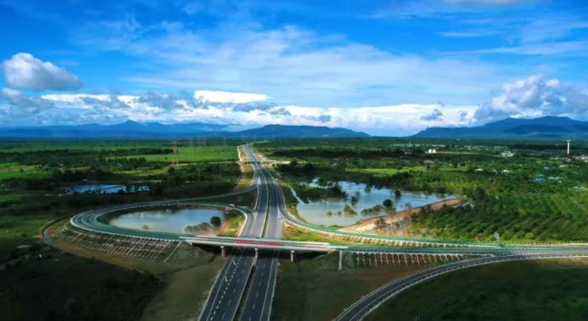 由中国路桥工程有限责任公司投资、建设和运营的柬埔寨金港高速公路于10月1日通车试运营,这是柬埔寨首条高速公路。(图源:中交四航局一公司)