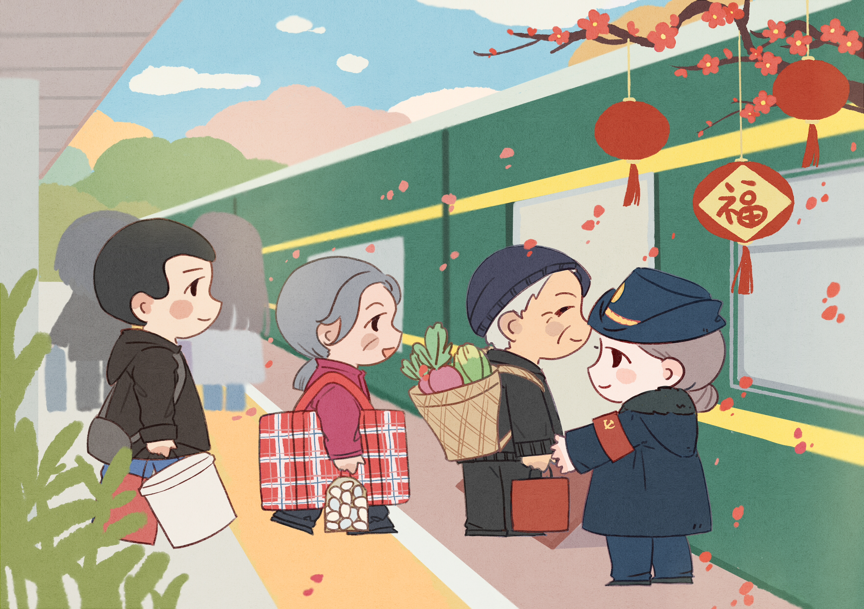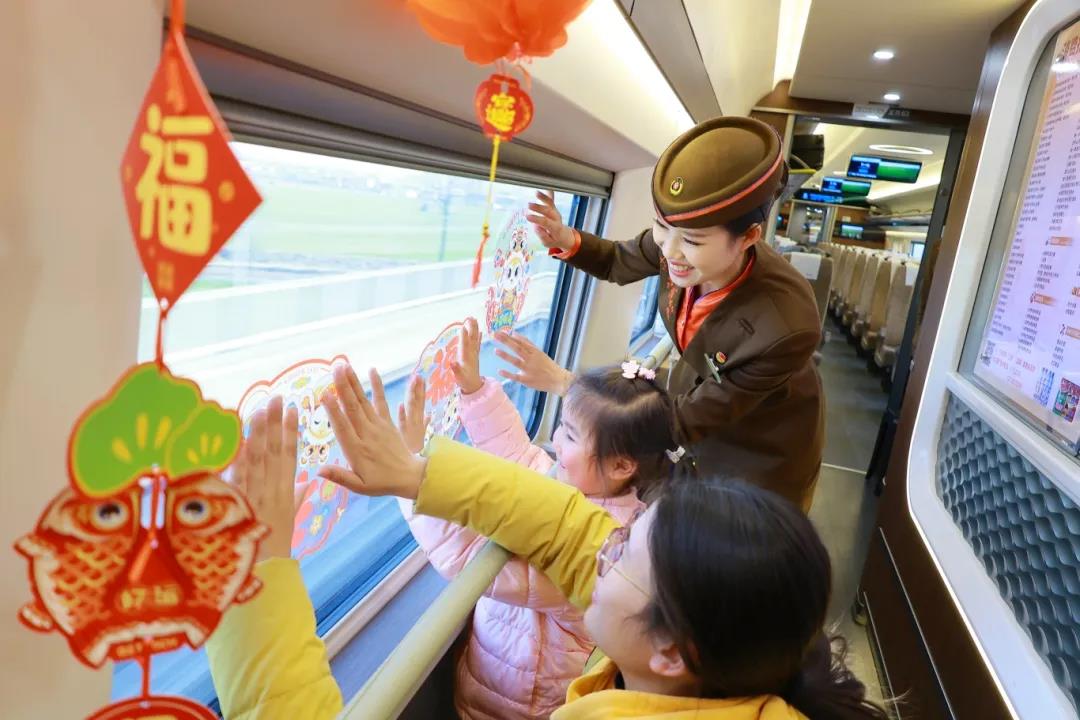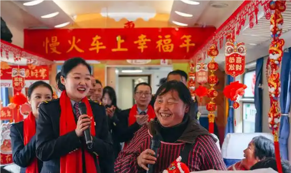 这趟223公里列车,如温暖纽带,紧密连接赣鄂两省及沿线百姓的生活,成为他们的铁路 “公交车”。走进车厢,年味扑面而来。大红灯笼高高挂,金色穗子轻晃,窗户贴着喜庆窗花,整个车厢张灯结彩,欢声笑语不断,让旅途疲惫烟消云散。