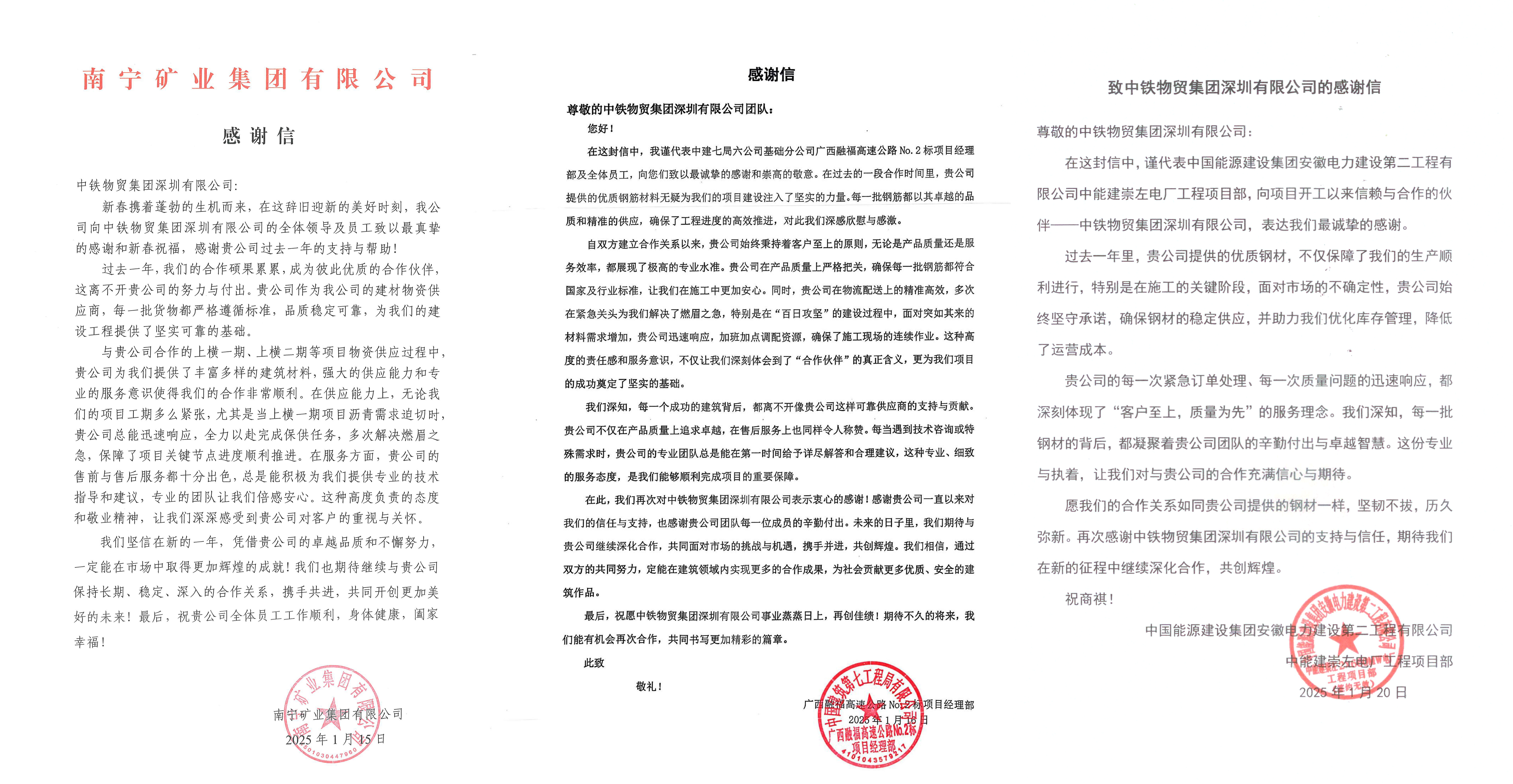 近日,中铁物贸深圳公司收到三家系统外合作单位感谢信。2025-01-22 发布人:刘小锋