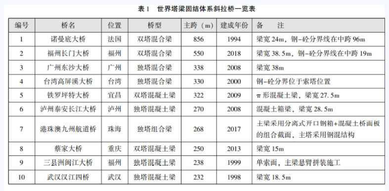 目前世界上建成的500m以上塔梁墩固结体系混合梁斜拉桥只有诺曼底大桥一座,国内采用塔梁墩固结体系斜拉桥主要为混凝土梁,跨度不超过350m,且多为单塔塔梁墩固结,跨度500m以上的塔梁墩固结体系混合梁斜拉桥在我国建桥史上仍是一片空白。世界上该体系的混合梁斜拉桥并不多。而对于塔梁墩固结体系混合梁超大跨径斜拉桥施工关键技术研究处于始发阶段,取得的成果并不多(见表1)。