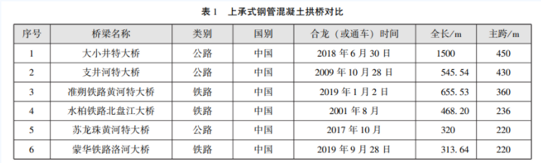 在我国,20世纪60年代南昌有色冶金设计研究院在山西省中条山铜矿尾矿输送线的27m跨桁架桥中,应用了钢管混凝土材料,其桁架压杆为外径140mm的钢管混凝土,这是我国在桥梁上部结构中首次应用钢管混凝土材料。目前我国已修建了大量钢管(箱)混凝土拱桥,其中重庆菜园坝公路大桥跨度达420m(中承式钢箱拱),贵州水柏铁路北盘江大桥跨度236米(上承式钢管拱)。