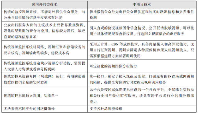 结合国内外同类的视频监控系统的技术参数和应用范围,对本项目的技术进行比较,具体结果见表1。与传统的视频监控系统相比,本项目解决了高速公路监控系统无法提供全量的实时监测问题,研究了负载均衡、大规模并发、海量高并发视频直播平台部署规模的估算方法以及CDN分发等技术,搭建了省级视频云平台实现全国高速公路视频监控资源汇聚上云,并能提供至少十万级并发能力,实现了视频的秒级查看。平台内接入视频智能分析等功能,大幅度提升或视频资源的使用效率。