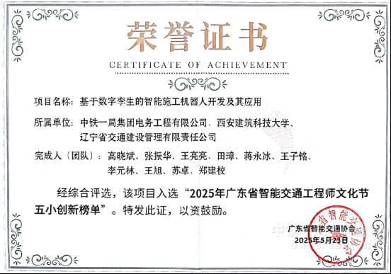 (广州讯)5月23日,从广东省智能交通协会传来喜讯,公司牵头申报的“基于数字孪生的智能施工机器人开发及其应用”成功入选“2025年广东省智能交通工程师文化节五小创新榜单”。