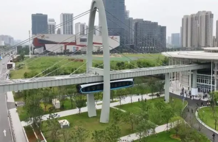 武汉我国首条悬挂式空中轨道列车试乘发车