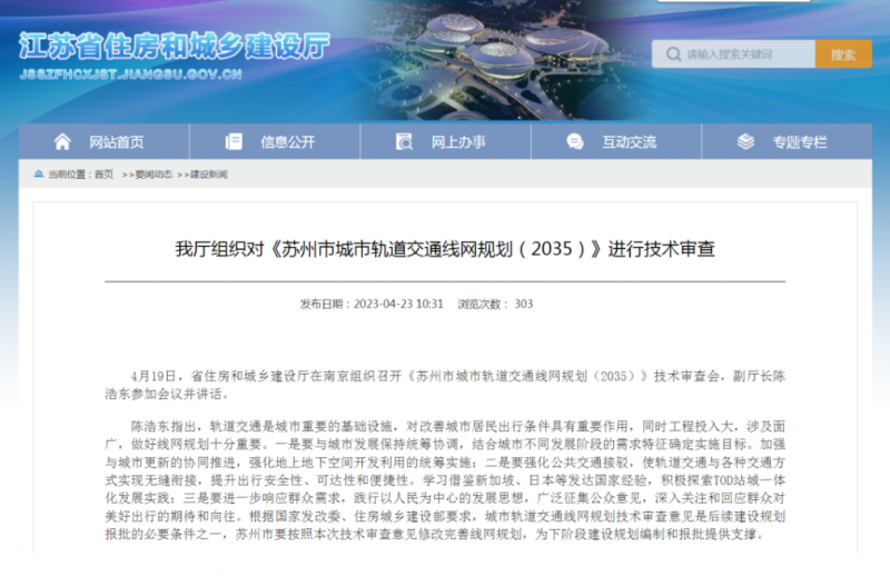 4月19日,省住房和城乡建设厅在南京组织召开《苏州市城市轨道交通线网规划(2035)》技术审查会,副厅长陈浩东参加会议并讲话。2023-04-24 -